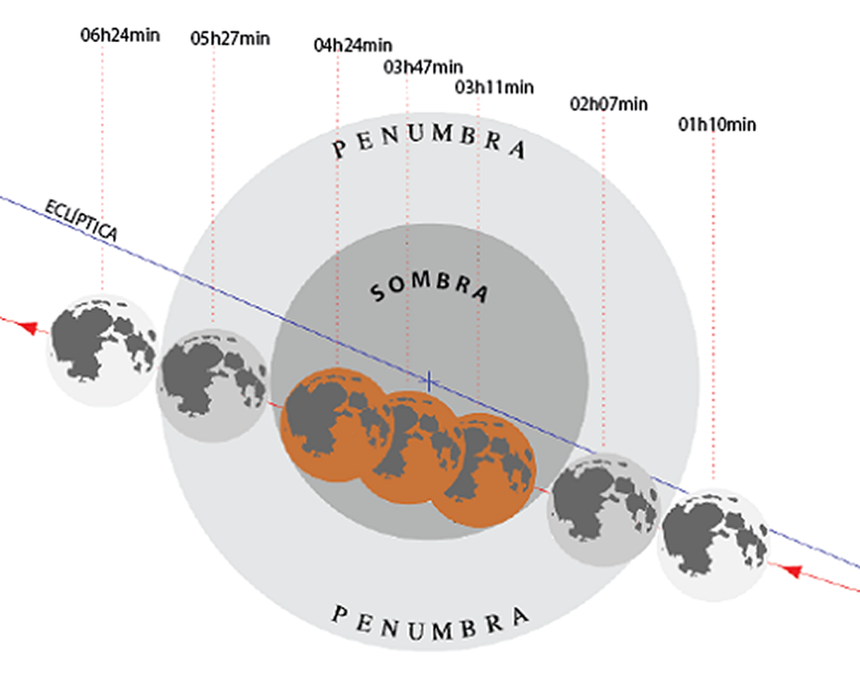 O eclipse total ocorrerá pelas 3h11min, quando a lua estiver totalmente dentro do cone de sombra da Terra.
