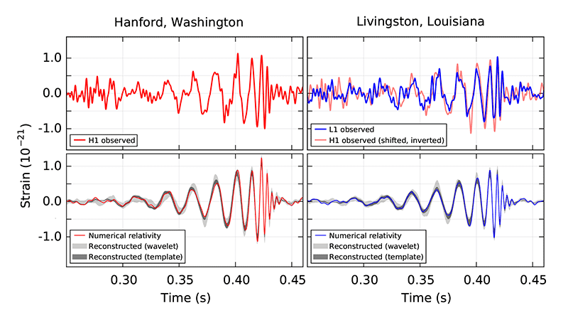 A 14 de setembro de 2015, sinais semelhantes foram observados em ambos interferômetros do LIGO. Os painéis top mostram o sinal medido em Hanford (superior esquerdo) e Livingston (superior direito) detectores. Os painéis de fundo mostram o esperado sinal produzido pela fusão de dois buracos negros, com base em simulações numéricas. Crédito: B. P. Abbott