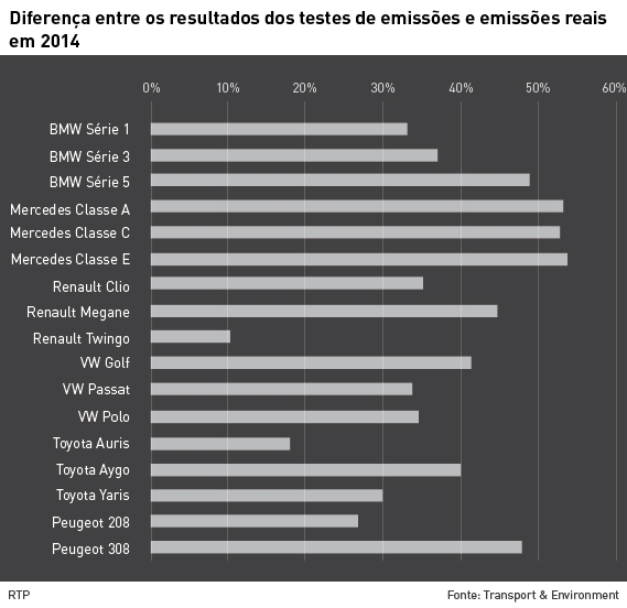 O relatório da Federação Europeia para os Transportes e Ambiente revela que a diferença entre as emissões em teste e as emissões reais tem aumentado constantemente desde o início do século. Em 2001, a diferença correspondia a oito por cento. Em 2014, a diferença tornou-se um verdadeiro fosso: as emissões reais são, em média, 40 por cento superiores às emissões em situação de teste.