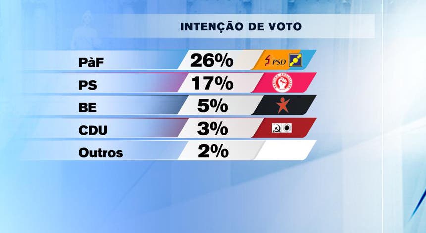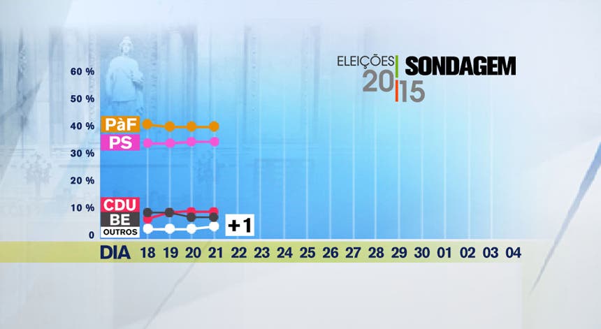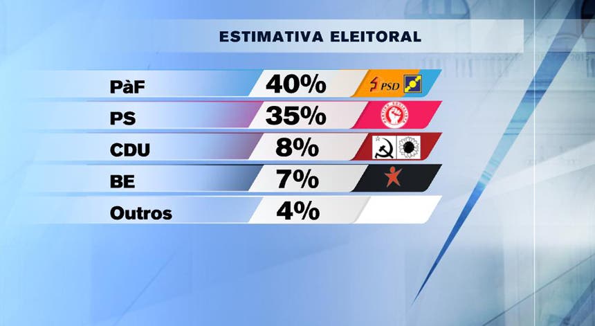 É este o cenário agora em perspetiva para o dia 4 de outubro: a coligação Portugal à Frente mantém os mesmos 40 por cento de domingo, ao passo que os socialistas continuam a obter um score de 35 por cento.