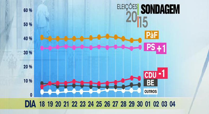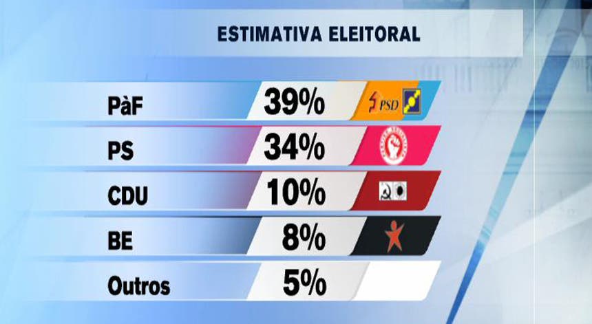 O PS ensaia assim uma ligeira recuperação de um ponto percentual, o que eleva a intenção de voto nos socialistas para os 34 por cento. A distância para a PàF, que se mantém nos 39 por cento, é agora de cinco pontos percentuais.