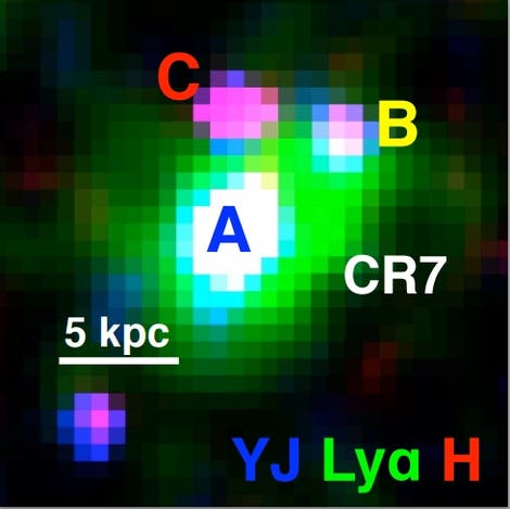 Mas a que designaram como CR7 foi, segundo os investigadores, de longe a galáxia mais brilhante alguma vez observada no Universo primitivo. Por si só, esta descoberta já constituía um enorme sucesso. Contudo, novas observações revelaram algo ainda mais surpreendente.
