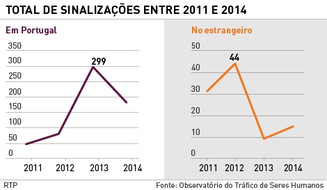 Comparativamente a 2013, em 2014 registou-se um decréscimo do número total de sinalizações (menos 36 por cento), influenciado apenas pelas situações detetadas em Portugal (menos 39 por cento), uma vez que aumentaram em 67 por cento as presumíveis situações de tráfico de seres humanos de portugueses no estrangeiro.
