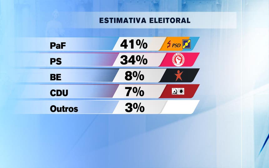 A coligação Portugal à Frente tem 41 por cento nos cálculos das estimativas eleitorais. O PS vem a seguir com 34 por cento. O Bloco de Esquerda surge como terceira força política à frente da CDU, com 8 por cento. A CDU regista 7 por cento.