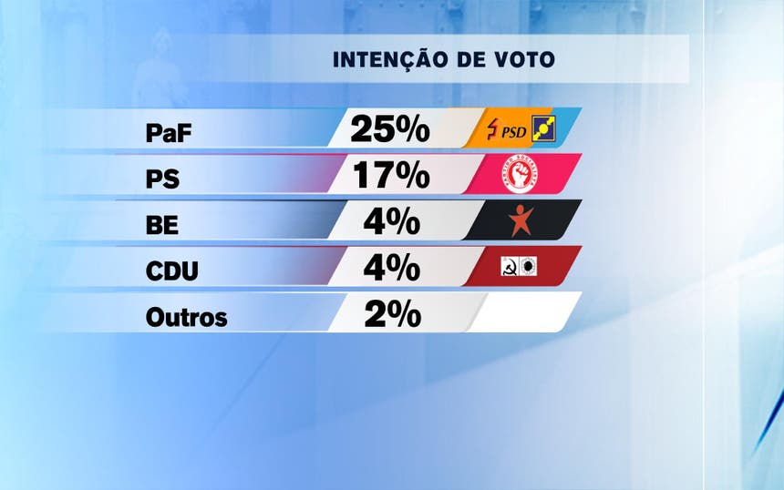 Ficha técnica da sondagem: Esta sondagem foi realizada pelo CESOP – Universidade Católica Portuguesa para a RTP entre os dias 14 e 17 de setembro de 2015. O Universo alvo é composto pelos indivíduos com 18 ou mais anos recenseados eleitoralmente residentes em Portugal Continental em lares com telefones fixos. Foram obtidos 647 inquéritos válidos, sendo 54% dos inquiridos mulheres, 30% da região Norte, 29% do Centro, 35% de Lisboa, 2% do Alentejo e 4% do Algarve. Todos os resultados obtidos foram depois ponderados de acordo com a distribuição de eleitores residentes no Continente por sexo, escalões etários e região na base dos dados do recenseamento eleitoral e do Censos 2011. A taxa de resposta foi de 60%*. A margem de erro máximo associado a uma amostra aleatória de 647 inquiridos é de 3,9%, com um nível de confiança de 95%. * A taxa de resposta é estimada dividindo o número de inquéritos realizados pela soma das seguintes situações: inquéritos realizados; inquéritos incompletos; e recusas.