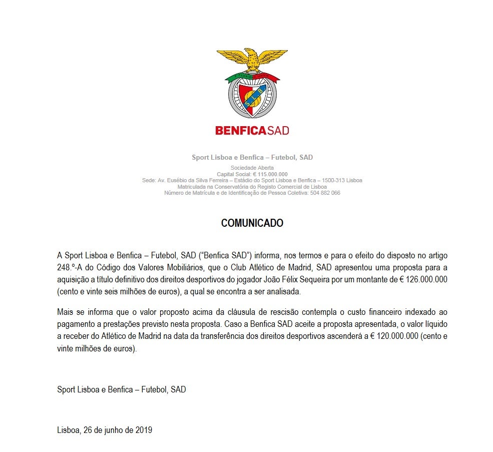 "A Sport Lisboa e Benfica –Futebol, SAD (“Benfica SAD”) informa, nos termos e para o efeito do disposto no artigo 248.º-A do Código dos Valores Mobiliários, que o Club Atlético de Madrid, SAD apresentou uma proposta para a aquisição a título definitivo dos direitos desportivos do jogador João Félix Sequeira por um montante de € 126.000.000 (cento e vinte seis milhões de euros), a qual se encontra a ser analisada".
