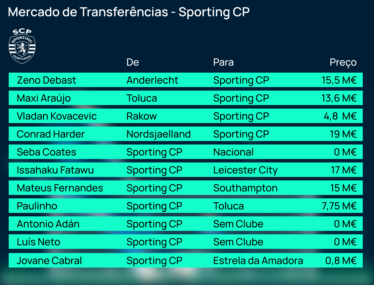 De destacar ainda as saídas em definitivo de Paulinho, que assinou pelo Toluca, Mateus Fernandes que rumou à Premier League, assinando pelo Southampton, e Fatawu saiu do Sporting para o Leicester City, após período de empréstimo. O ganês deixa 17 milhões de euros nos cofres do campeão nacional.Benfica. O mercado levou Roger Schmidt
