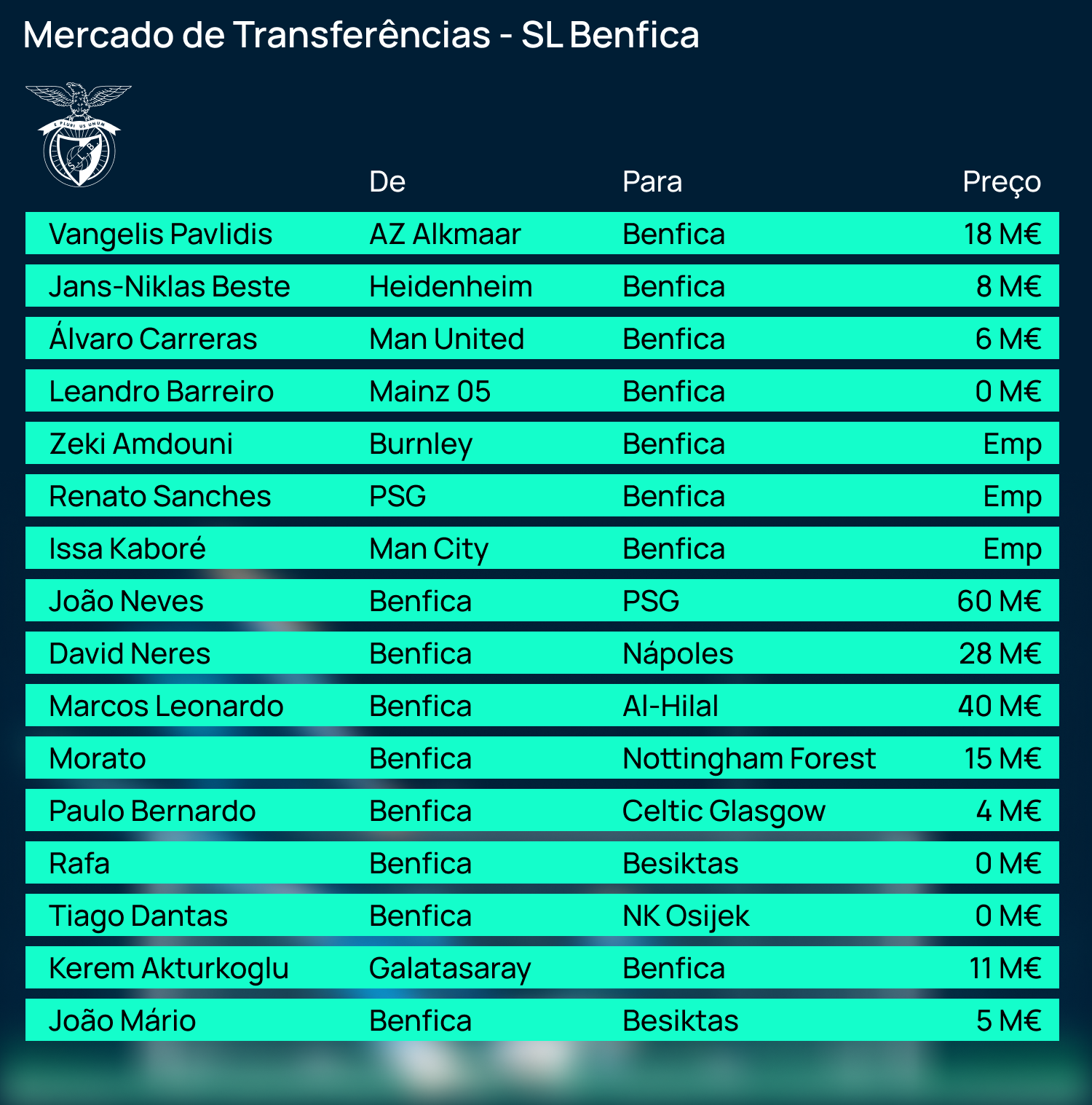 João Neves, um dos maiores ativos do clube, acabou por ser vendido ao Paris Saint-Germain por 60 milhões de euros, um valor que ficou muito abaixo da cláusula de rescisão do jogador. Sem espaço nas opções de Roger Schmidt, David Neres também foi vendido, ao Nápoles, por um valor a rondar os 28 milhões de euros.