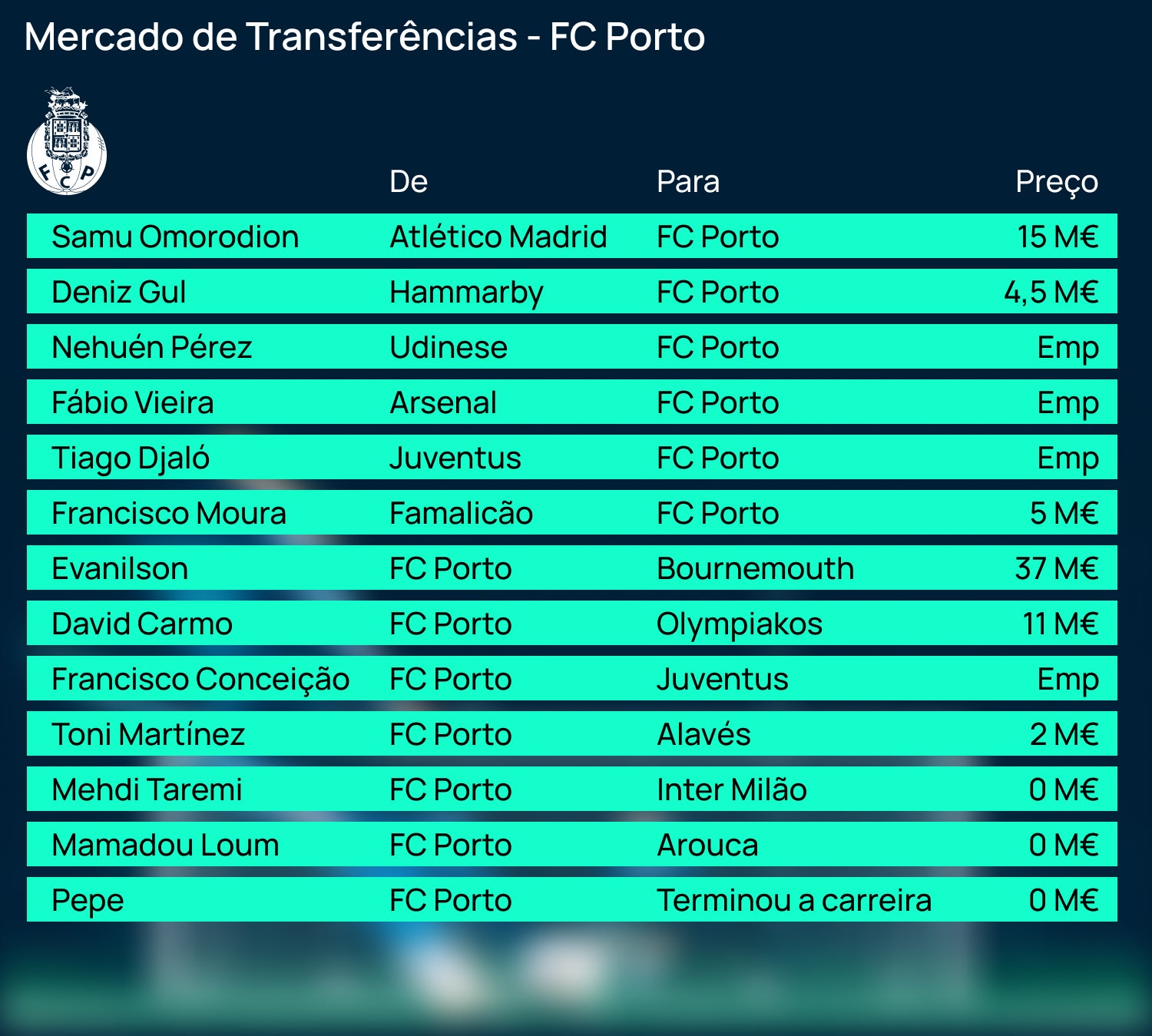 O grande destaque vai para a contratação de Samu Omorodion, que rumou à cidade invicta, depois de vários meses de negociações entre Atlético de Madrid e Chelsea. O jogador acabou por custar 15 milhões de euros ao FC Porto. Deniz Gul, do Hammarby, também se juntou ao plantel de Vítor Bruno, numa transferência a rondar os 4,5 milhões de euros.