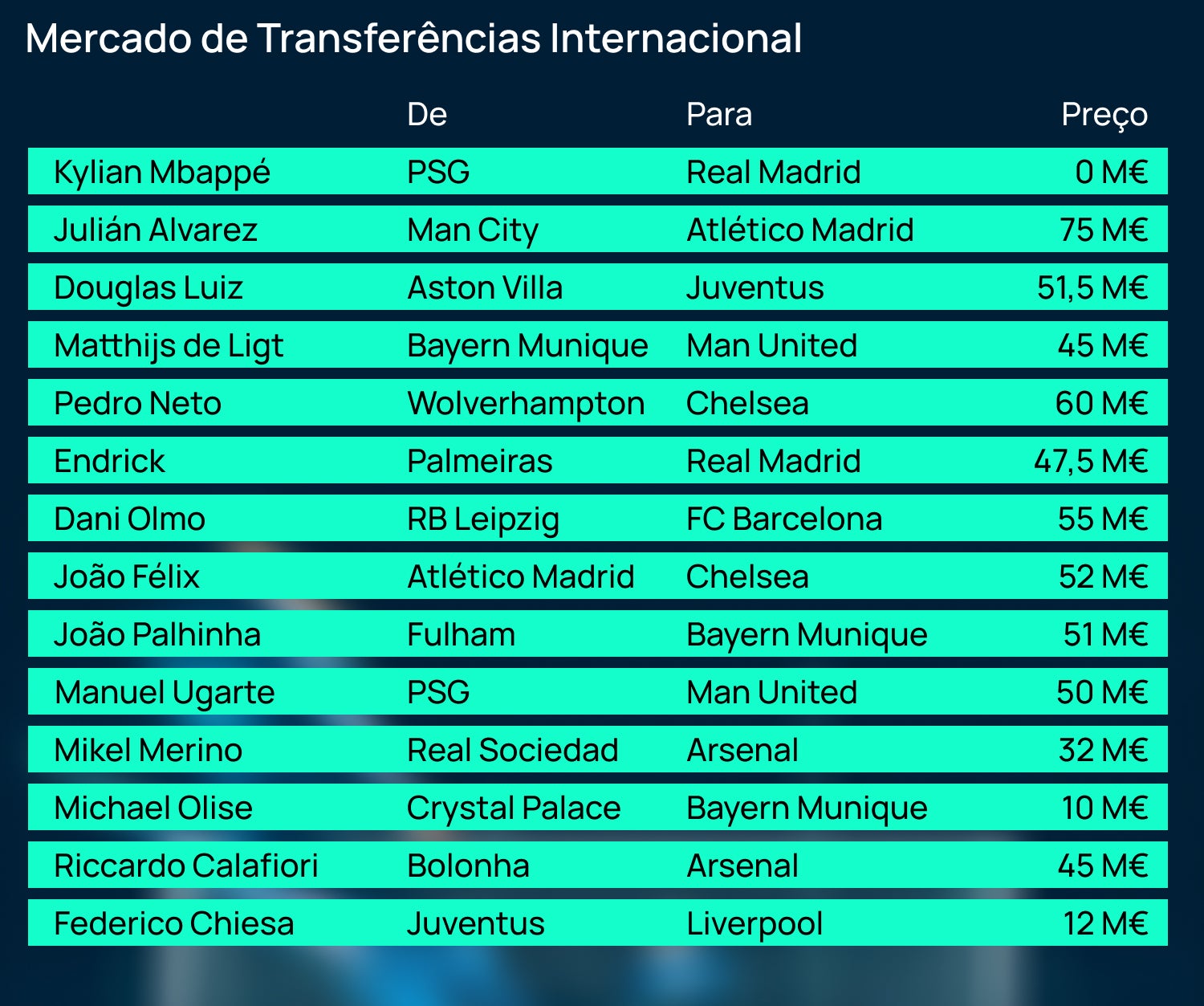 Por último, Pepe, histórico capitão portista, terminou contrato e decidiu dar por encerrada a carreira.Casamento Mbappé-Real Madrid realizou-seFora de Portugal, o mercado também mexeu com grandes nomes. Depois de terminar contrato com o Paris Saint-Germain, Kylian Mbappé juntou-se finalmente ao Real Madrid numa transferência que já era esperada há alguns anos. O campeão espanhol apresentou também Endrick, pérola brasileira do Palmeiras.