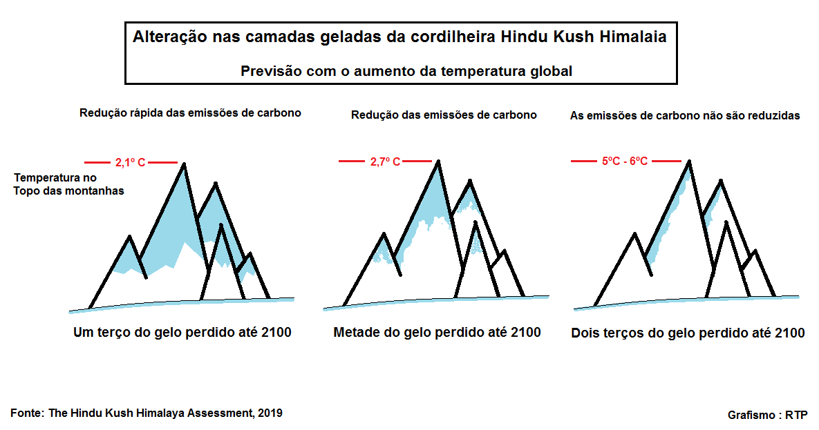 Mesmo que houvesse um forte travão nas emissões de carbono e fosse possível limitar o aquecimento global a 1,5 graus centígrados, 36 por cento das calotes do Hindu Kush e dos Himalaias desapareceriam até 2100.
