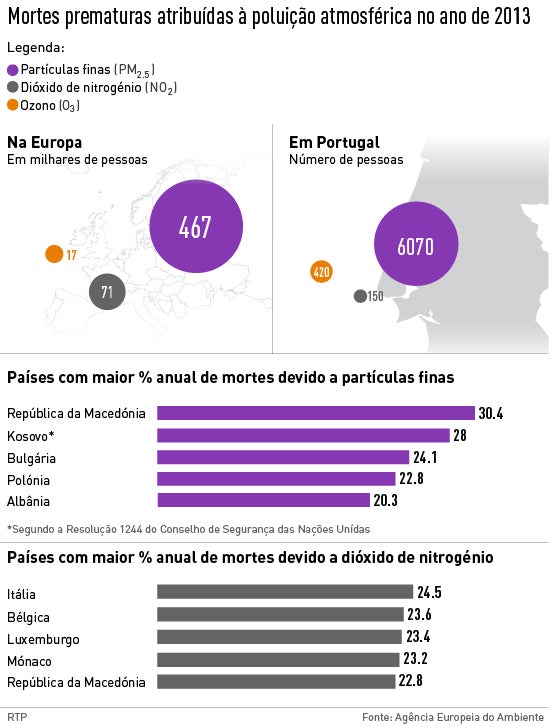 A conclusão é apresentada no mais recente relatório da Agência Europeia do Ambiente (EEA), divulgado esta quarta-feira. Segundo o documento, a exposição a partículas finas, dióxido de azoto e ozono causou 6.640 mortes prematuras em Portugal, um valor bastante mais elevado que o registado anteriormente.