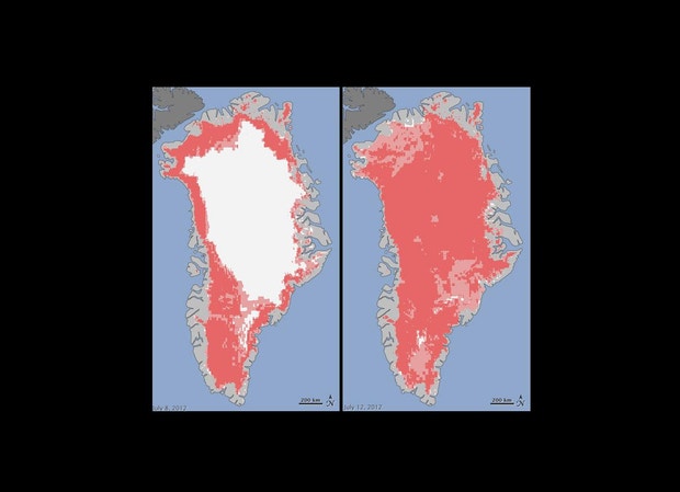 Cerca de 97 por cento da superfície da camada de gelo que cobre a Gronelândia derreteu entre os dias 8 e 12 de julho. Este é o degelo mais vasto de que há registo nos 30 anos de observações de satélite da ilha.