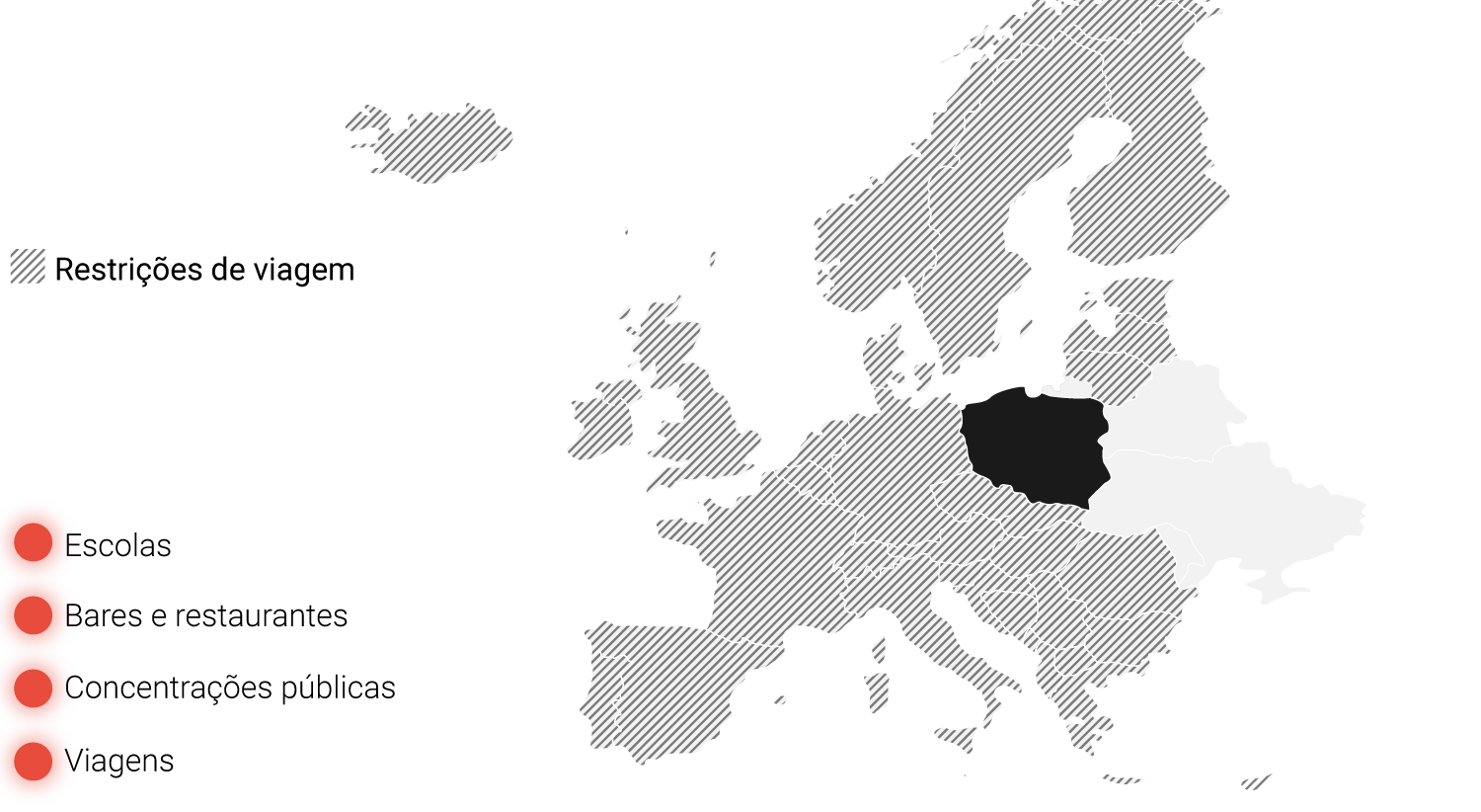 Não há voos ou comboios internacionais. Os estrangeiros são proibidos de entrar, a menos que trabalhem ou residam na Polónia. Qualquer pessoa que regresse tem de ficar em quarentena por 14 dias.