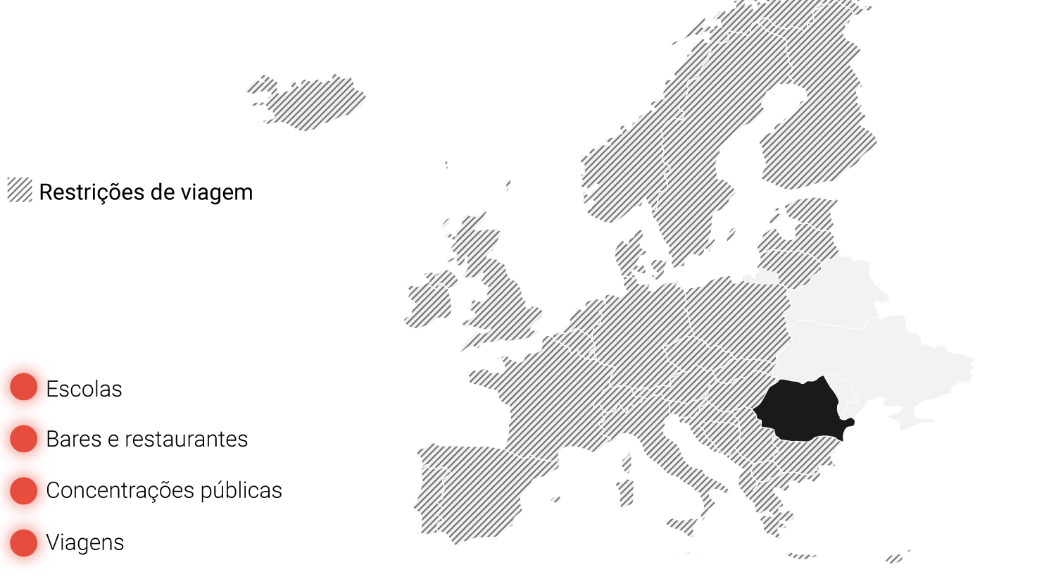 A Roménia fechou as escolas. Os cidadãos podem sair de casa apenas para trabalhar, com uma nota assinada pelos empregadores, e comprar alimentos. Os movimentos dos idosos são particularmente restritos e não podem usar transportes públicos.