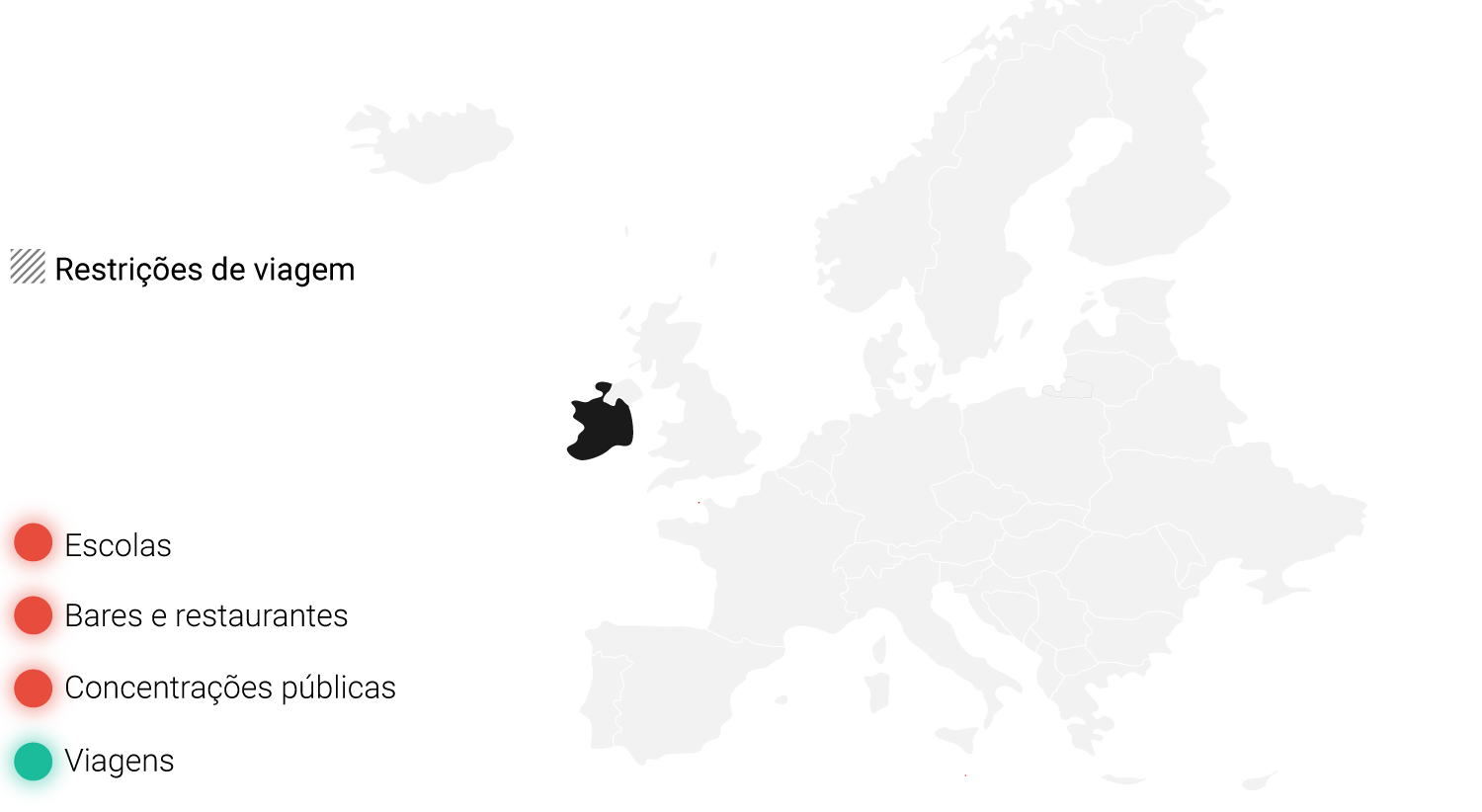 A Irlanda fechou escolas, universidades, bares e creches, assim como todos os serviços de vendas não essenciais. Os eventos sociais organizados são proibidos e as reuniões ao ar livre são limitadas a quatro pessoas, a menos que todos sejam da mesma casa. Cafés e restaurantes podem oferecer apenas comida para viagem.