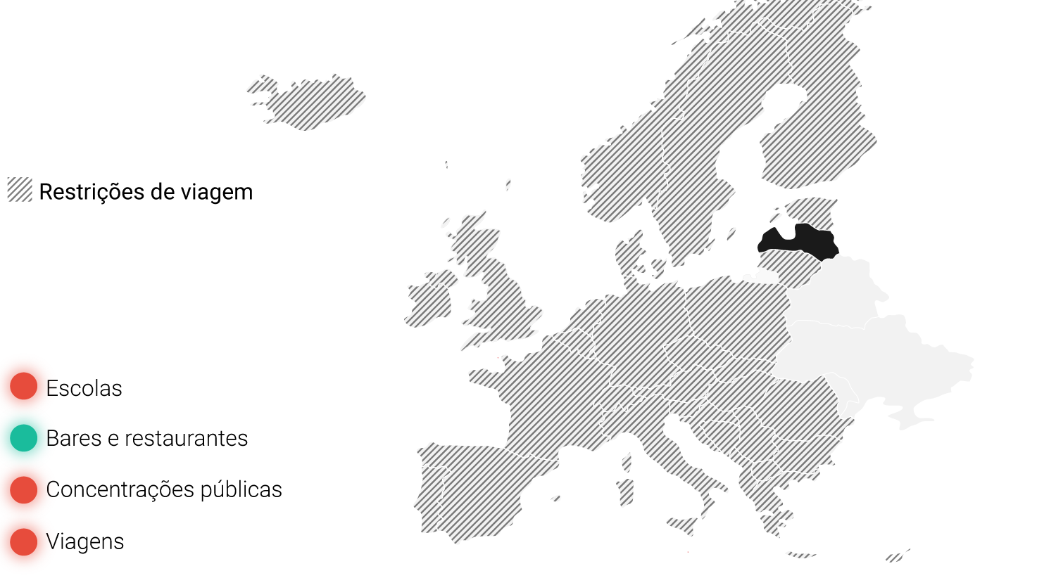 A Letónia suspendeu a entrada de quase todos os estrangeiros no país desde 17 de março. Todas as viagens internacionais, por via aérea, ferroviária, marítima e rodoviária, foram canceladas