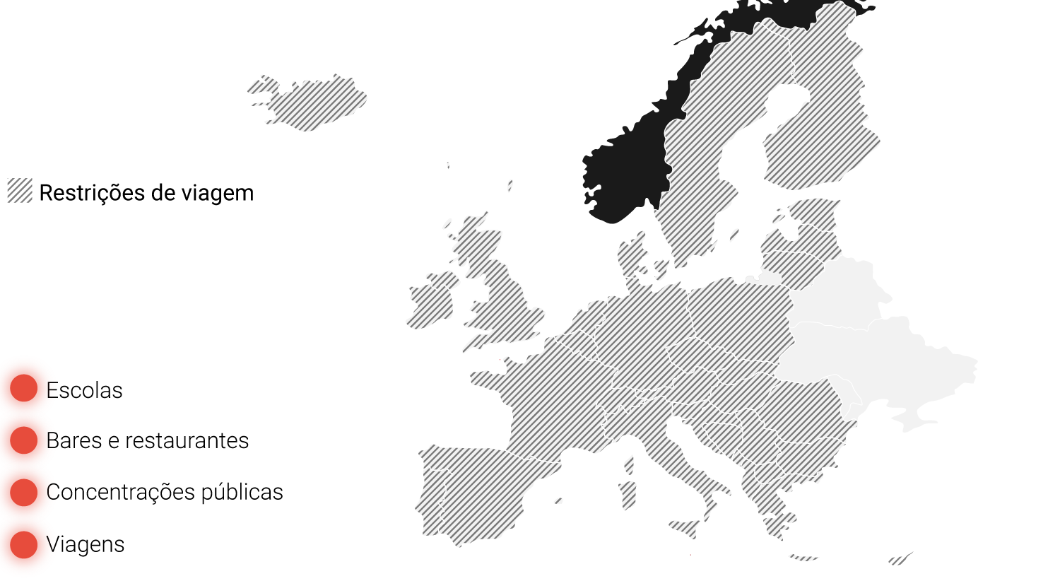 As fronteiras estão fechadas, exceto para noruegueses e residentes estrangeiros. As pessoas que regressam do exterior devem ficar em quarentena por 14 dias.