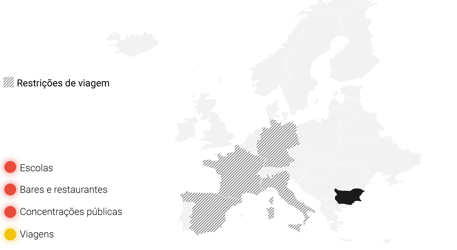 O Parlamento da Bulgária declarou estado de emergência até 13 de abril. Sob as regras de emergência, escolas, universidades e jardins de infância vão permanecer fechados até 12 de abril. Restaurantes, cafés, ginásios e teatros estão fechados também.