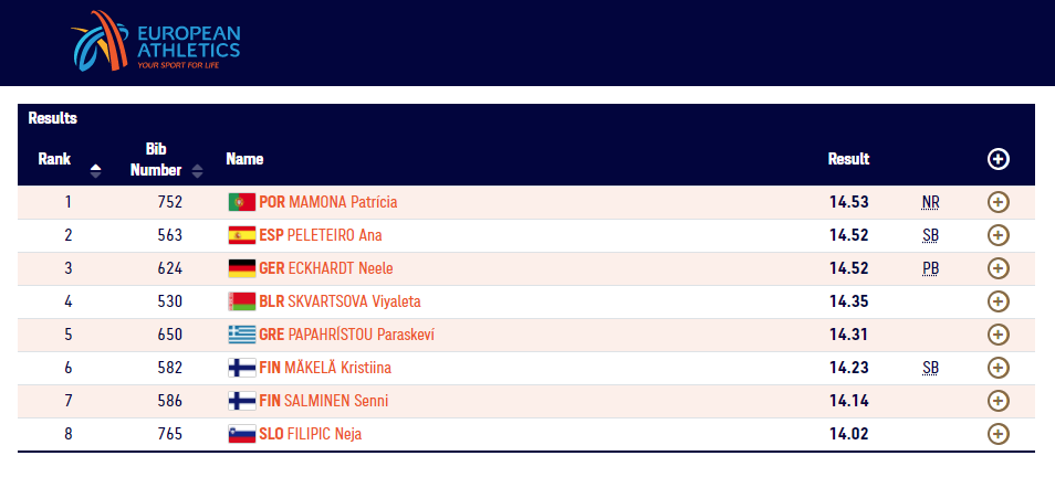 A atleta nacional teve nesta final, como principal adversária a germanica Neele Eckhardt e a espanhola Ana Peleteiro, com um salto muito próximo de Mamona (14,52 metros).