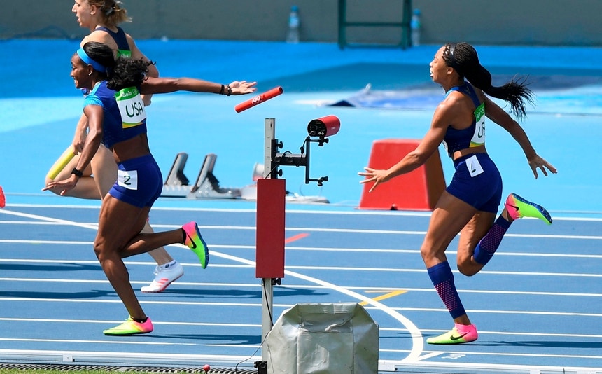 Na corrida, Allyson Felix deixou cair o testemunho quando tentava entregá-lo a English Gardner, um incidente que acabou por desqualificar as atuais campeãs olímpicas.