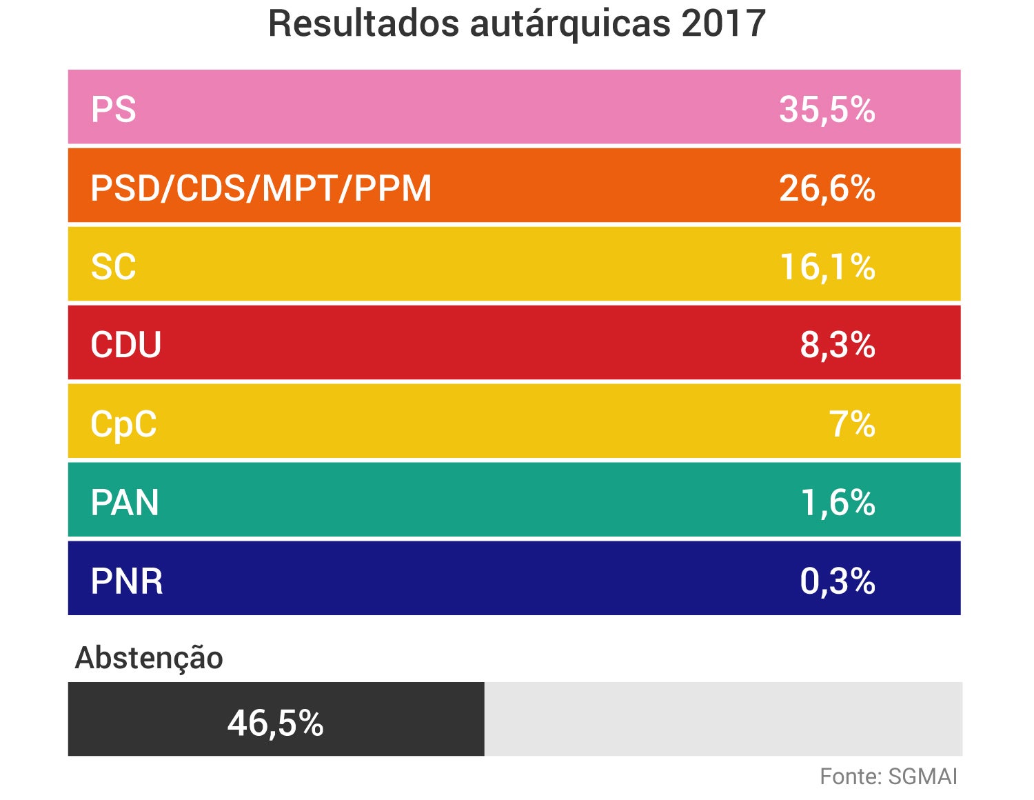 Por fim, lembramos também os resultados de há quatro anos, nas Eleições Autárquicas de 1 de outubro de 2017.