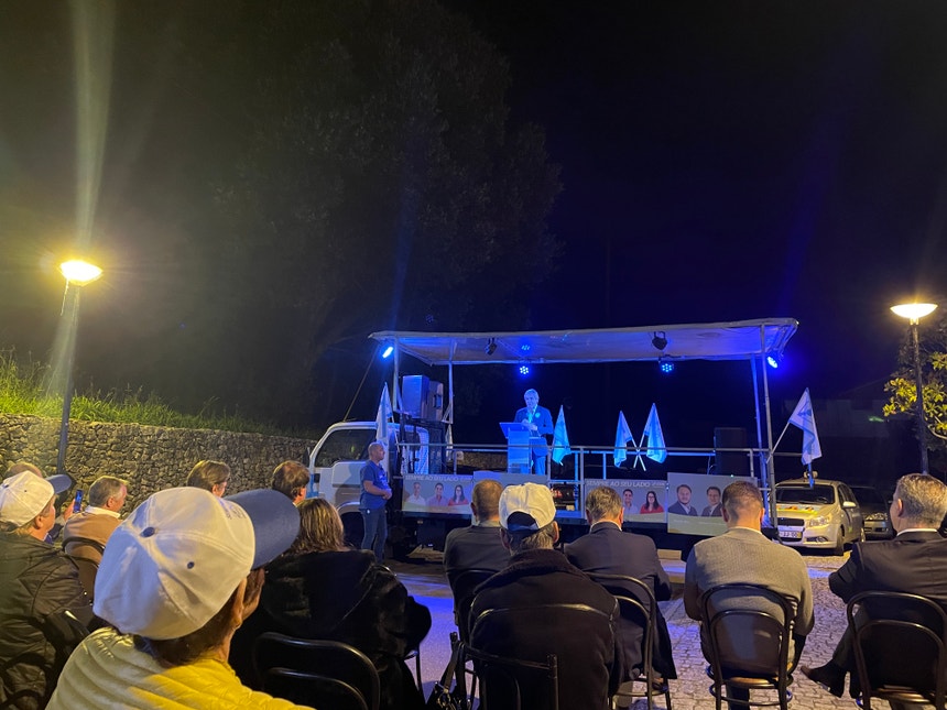 É campanha à antiga. Febras na brasa, finos sempre a sair, e um líder partidário a discursar em cima de uma carrinha, rodeado de um sistema de som improvisado, que às vezes falha
