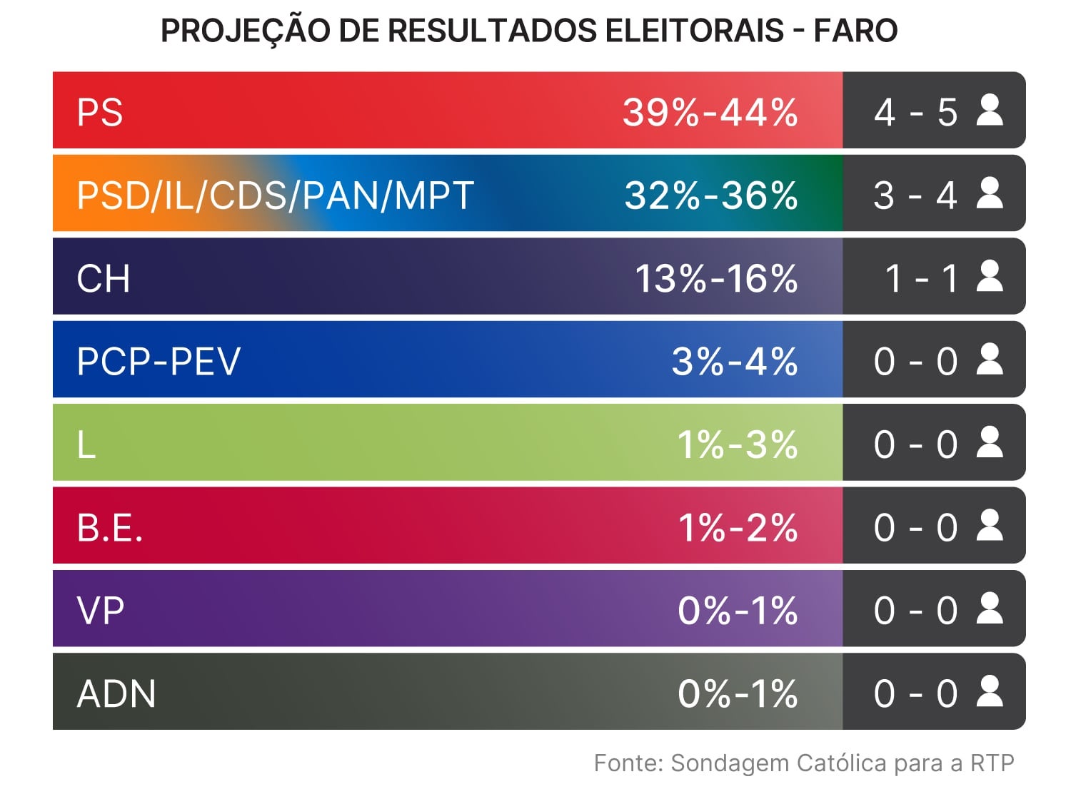 Em Faro, a vitória é para o candidato do Partido Socialista, António Pina, que obtém entre 39 e 44 por cento dos votos. Em segundo lugar, segundo a projeção, está o candidato da coligação PPD/PSD/IL/CDS/PAN/MPT, com 32 a 36 por cento dos votos. Em terceiro lugar surge o Chega, com 13 a 16 por cento dos votos.