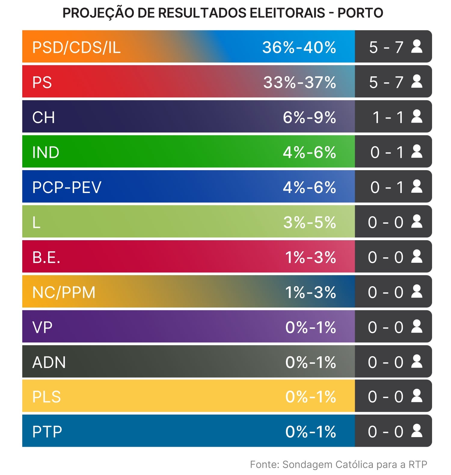 No Porto, o cenário também é de empate entre o candidato da coligação PSD/CDS/IL e o do Partido Socialista, embora com vantagem para Pedro Duarte. De acordo com a projeção, Pedro Duarte tem entre 36 a 40 por cento dos votos e Manuel Pizarro tem entre 33 a 37 por cento, o que em mandatos se traduz a entre cinco a sete.