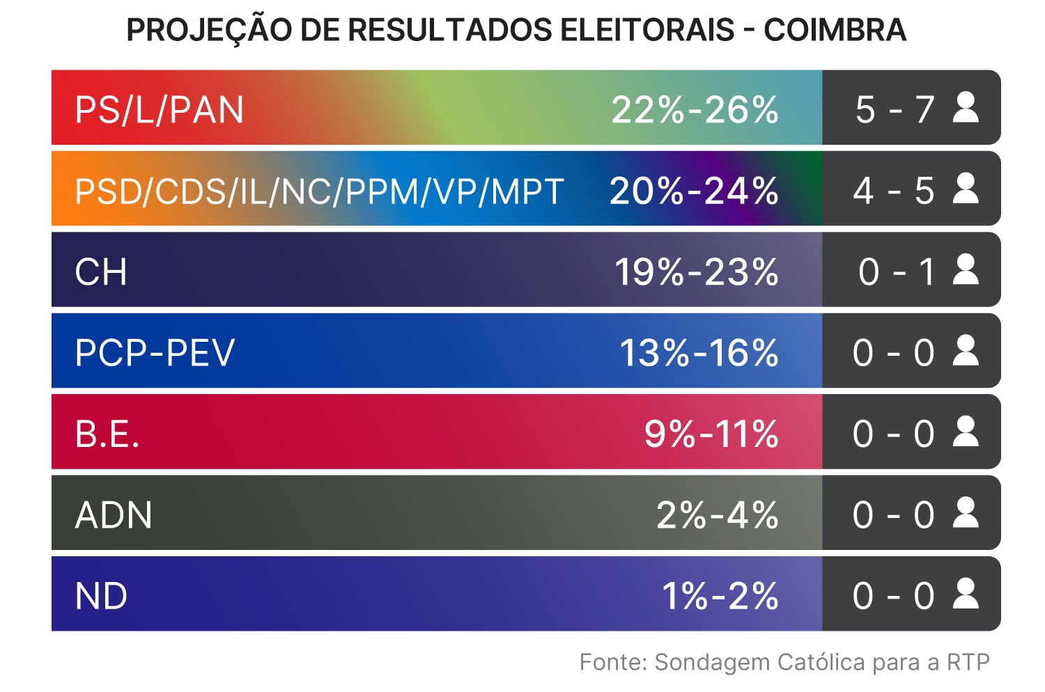 Em Coimbra, a projeção aponta para uma vitória da coligação PS/Livre/PAN, com 42 a 46 por cento dos votos para a candidata Ana Abrunhosa.