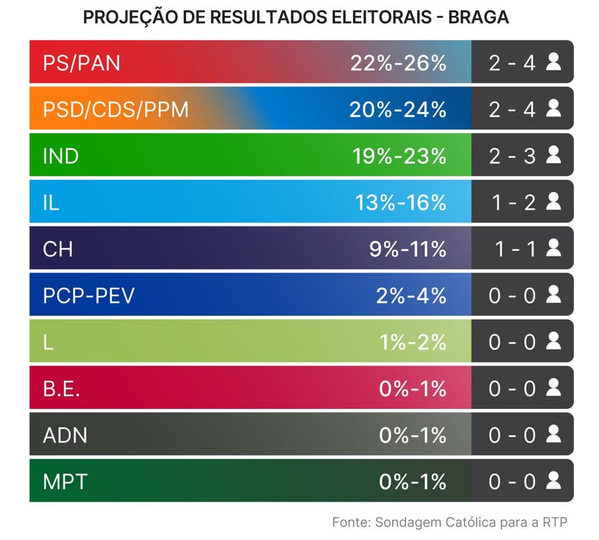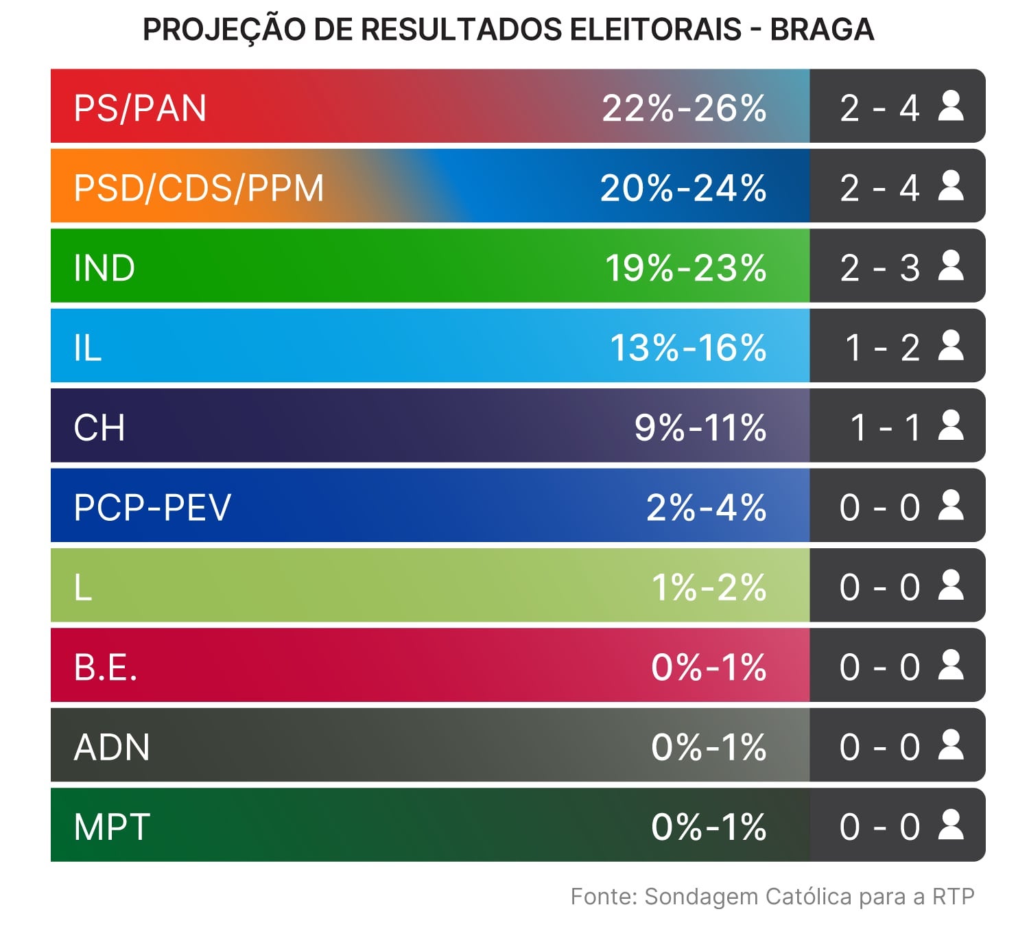 Em Braga, há projeção de empate entre o candidato do PS/PAN, António Braga, e o candidato do PSD/CDS/PPM, João Rodrigues. António Braga tem ligeira vantagem, com 22 a 26 por cento dos votos. João Rodrigues surge logo de seguida, com 20 a 24 por cento dos votos. Em terceiro lugar surge o candidato independente Ricardo Silva, com 19 a 23 por cento dos votos.