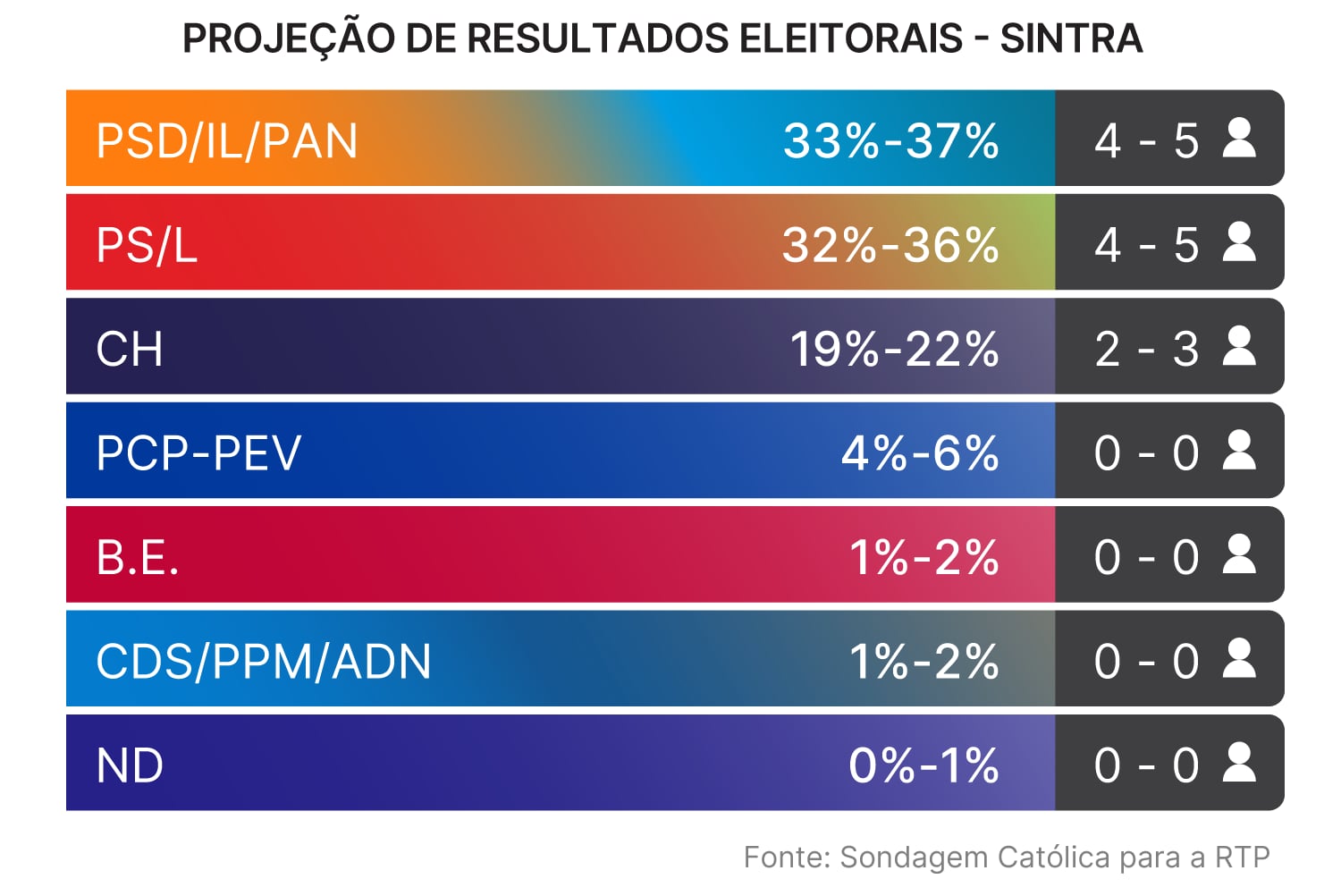 Em Sintra, o empate é entre Marco Almeida (PSD/IL/PAN) e Ana Mendes Godinho (PS/Livre). Marco Almeida surge com 33 a 37 por cento dos votos e a ex-ministra com 32 a 36 por cento. O Chega fica em terceiro, com 19 a 22 por cento dos votos.