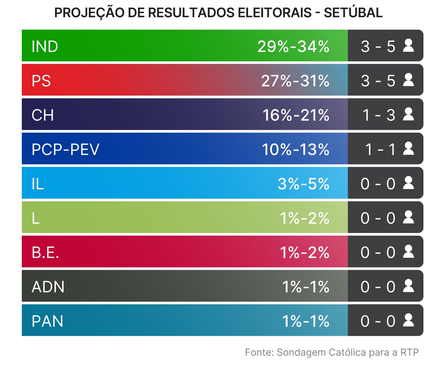 Em Setúbal, o empate é entre a candidata independente Maria das Dores Meira (29 a 34 por cento dos votos) e o candidato socialista, Fernando José (27 a 31 por cento dos votos). Em terceiro lugar surge o Chega, com 16 a 21 por cento dos votos.