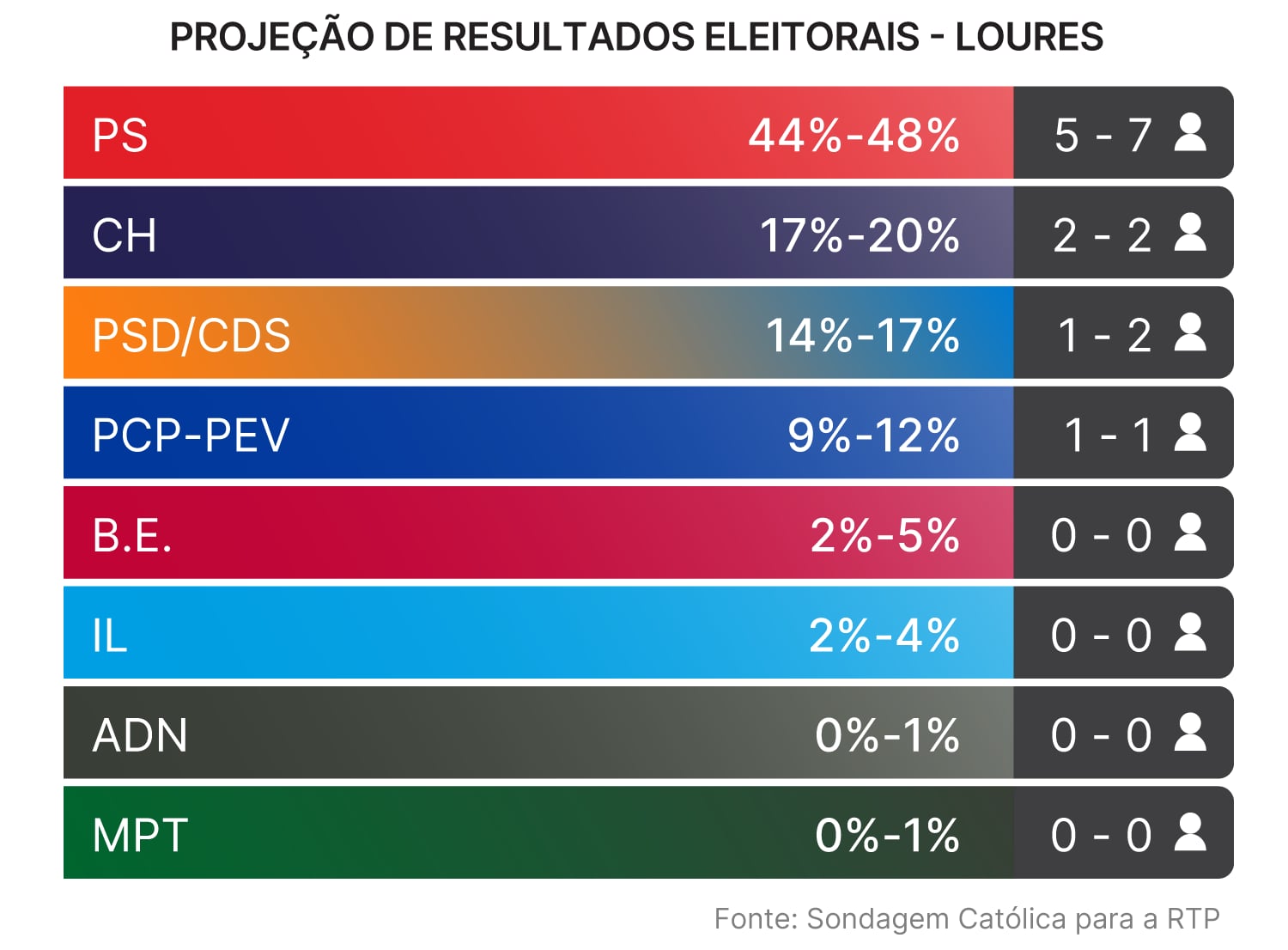 Em Loures, a projeção dá uma nova vitória a Ricardo Leão, do PS, que consegue entre 44 a 48 por cento dos votos. Em segundo lugar surge o Chega, com 17 a 20 por cento dos votos. A coligação do PSD/CDS surge em terceiro, com 14 a 17 por cento dos votos.