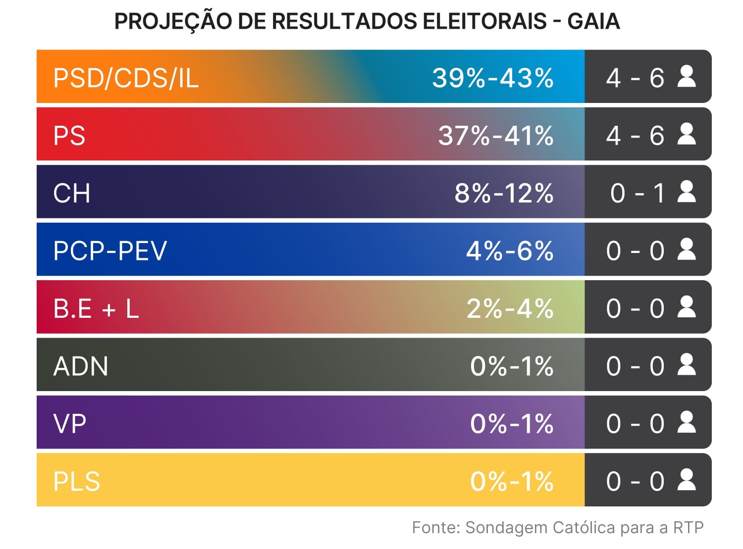Em Vila Nova de Gaia, a projeção dá empate à coligação do PSD/CDS/IL (39 a 43 por cento dos votos) e ao PS (37 a 41 por cento dos votos). Em terceiro surge o Chega, com oito a 12 por cento dos votos.