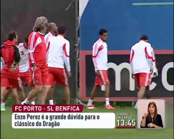 No Benfica a dúvida maior para o jogo com o FC Porto é Enzo Perez. O médio argentino saiu do jogo com o Estoril lesionado na perna direita e ainda não se sabe se pode jogar no sábado.