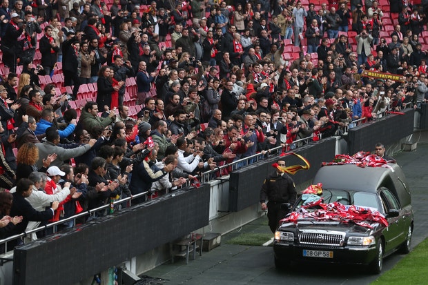 Depois de o corpo do antigo jogador do Benfica ter estado em câmara ardente desde domingo à noite, no Estádio da Luz, a urna foi levada ao relvado para uma volta ao estádio perante cerca de dez mil adeptos.