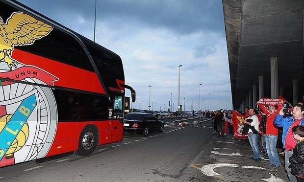 A equipa do Benfica apoiada pelos seus adeptos partiu de Lisboa com todos os seus jogadores, incluindo Maxi Pereira que cumpre um jogo de castigo e por isso não poderá jogar.