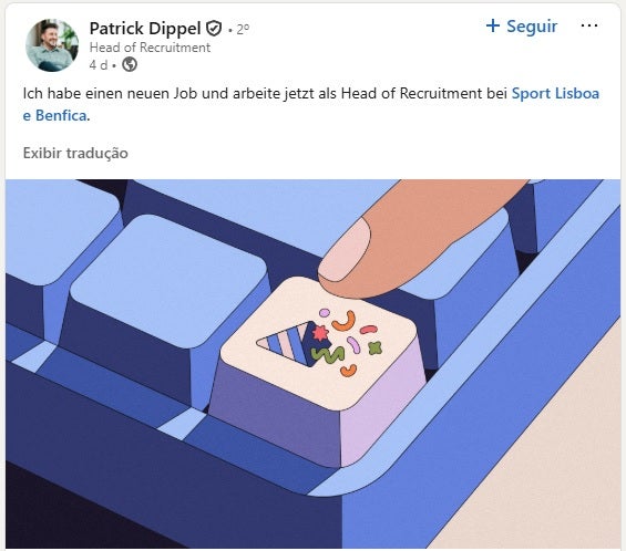 “Tenho um novo emprego, agora trabalho como chefe de recrutamento no Benfica”, escreveu o sucessor de Pedro Ferreira, que deixou a equipa de scouting das águias no verão de 2024.