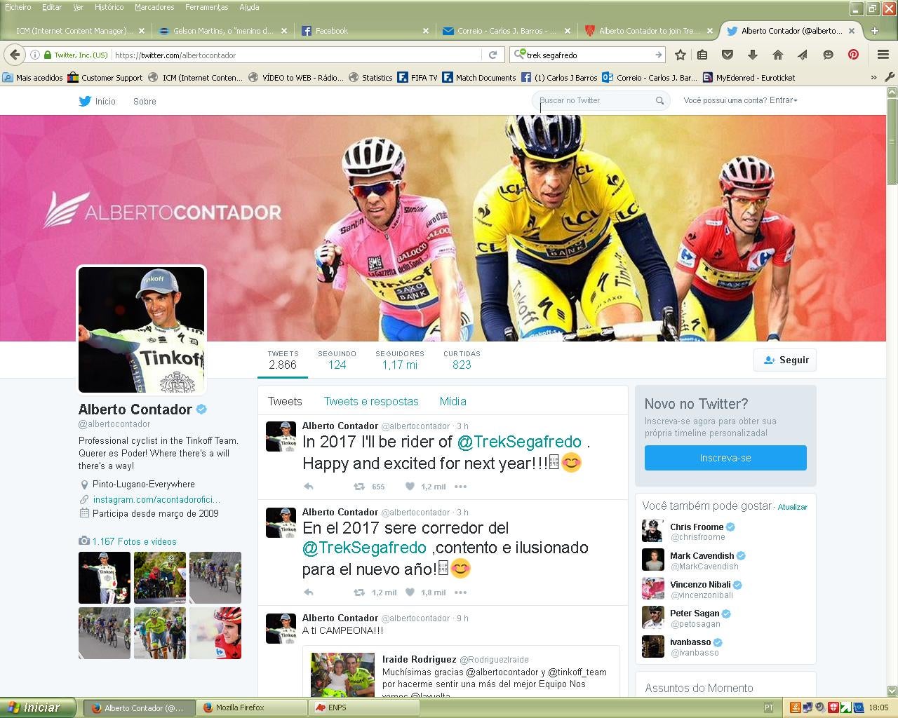 O ciclista espanhol Alberto Contador, que já venceu por duas vezes a Volta a França, vai abandonar a Tinkoff e representar no próximo ano a Trek-Segafredo, anunciou esta quinta-feira a equipa norte-americana.