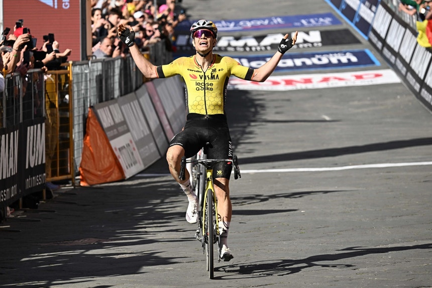 O corredor da Visma-Lease a Bike, um dos principais nomes do pelotão, colocou fim a uma ‘seca’ de nove meses sem triunfos no final dos 181 quilómetros entre Gubbio e Siena, somando a 50.ª vitória da carreira à frente de Del Toro, segundo com as mesmas 4:15.08 horas.