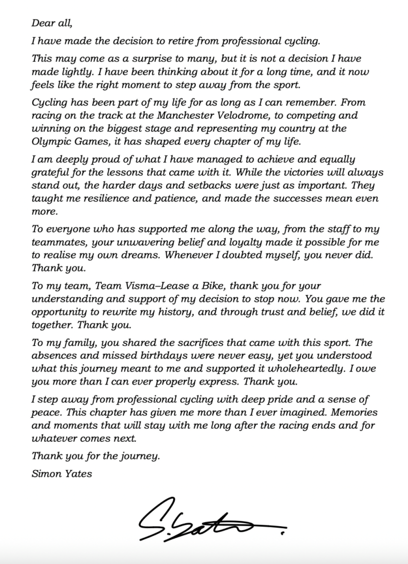 O anúncio foi feito através da Visma-Lease a Bike, equipa que representava o atleta britânico. Num comunicado publicado no site oficial da equipa neerlandesa, Simon Yates explica que a decisão não foi tomada “de ânimo leve”, mas surgiu “no momento certo”.