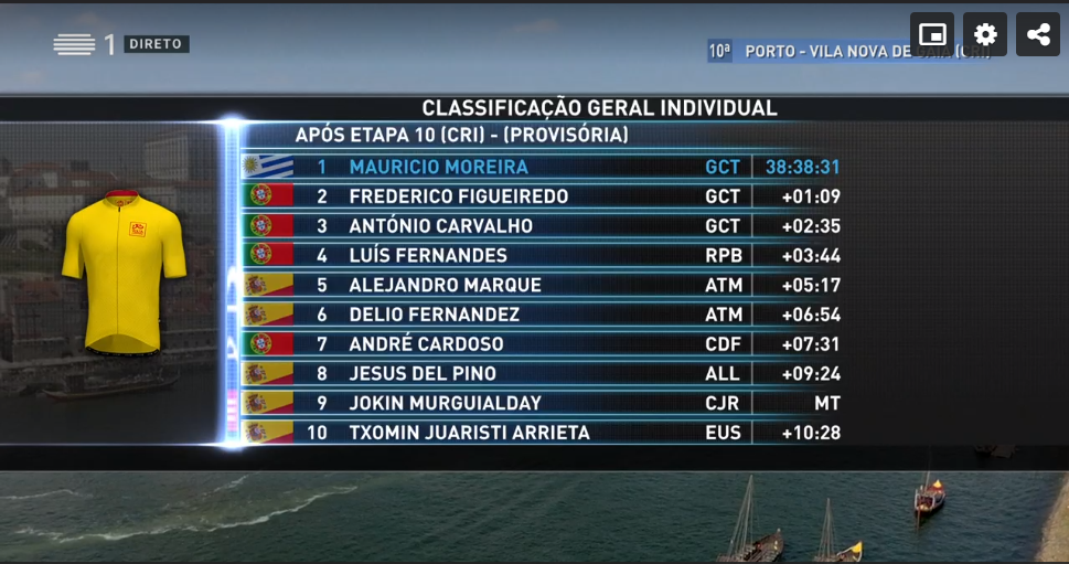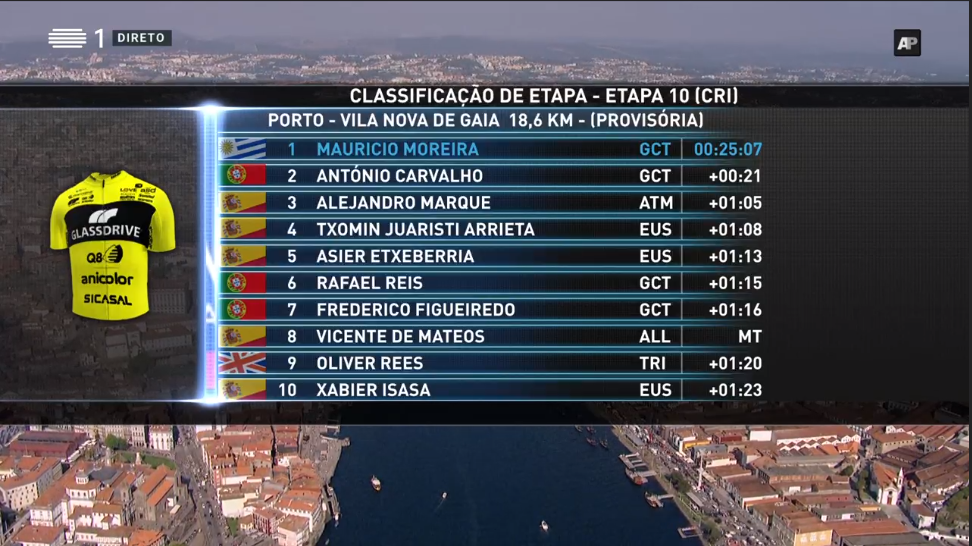 Desde o primeiro dia que o nome do uruguaio soava com força, na boca de rivais e especialistas, como o grande favorito à vitória final, e Moreira não defraudou as expectativas da Glassdrive-Q8-Anicolor, que preteriu ‘Fred’, claramente o ciclista mais forte desta edição, para que a amarela fosse sua em Gaia.