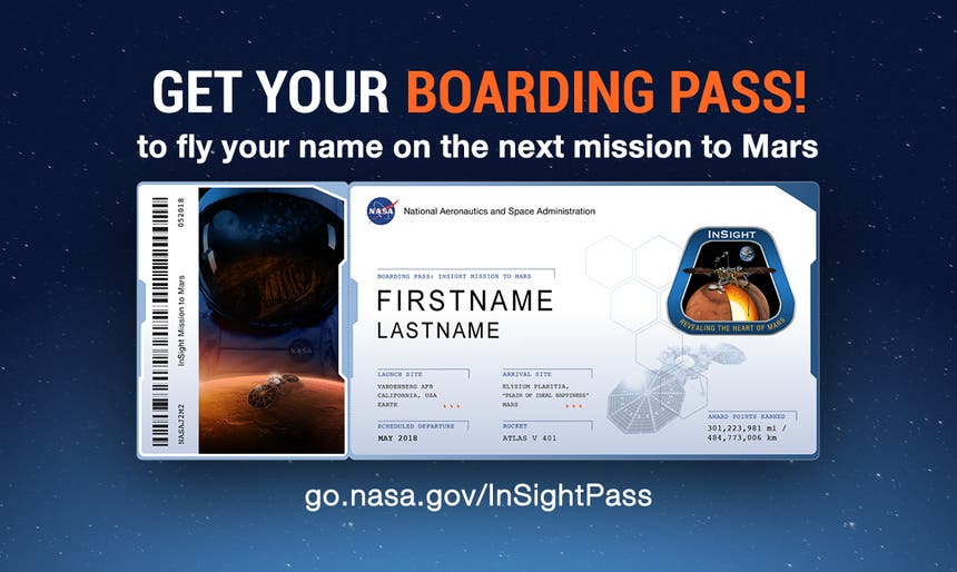 Trata-se de um bilhete especial que dá lugar ao embarque do nome do proponente, que viajará a bordo da InSight com destino a Marte.