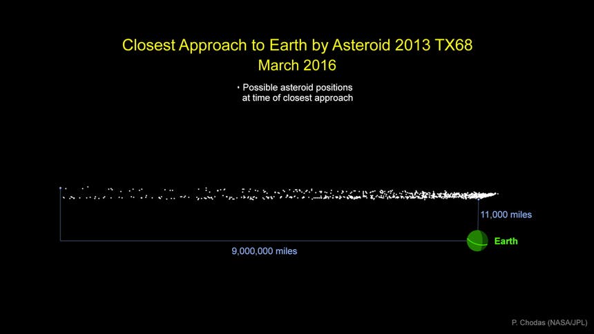 "As possibilidades de colisão em qualquer uma das três datas da passagem do 2013 TX68 são demasiado pequenas para ser uma preocupação real", disse Paul Chodas, CEO do centro de estudos NEO do Jet Propulsion Laboratory da NASA em Pasadena, Califórnia.
