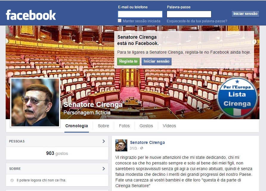 Entre as várias notícias falsas utilizadas para o estudo, os pesquisadores, todos italianos, colocaram na rede uma polémica com uma personagem política de nome Senador Cirenga.