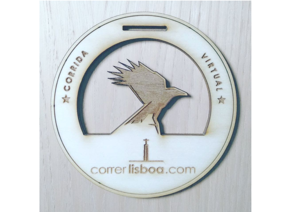 Medalha da participação na primeira prova virtual feita em madeira.