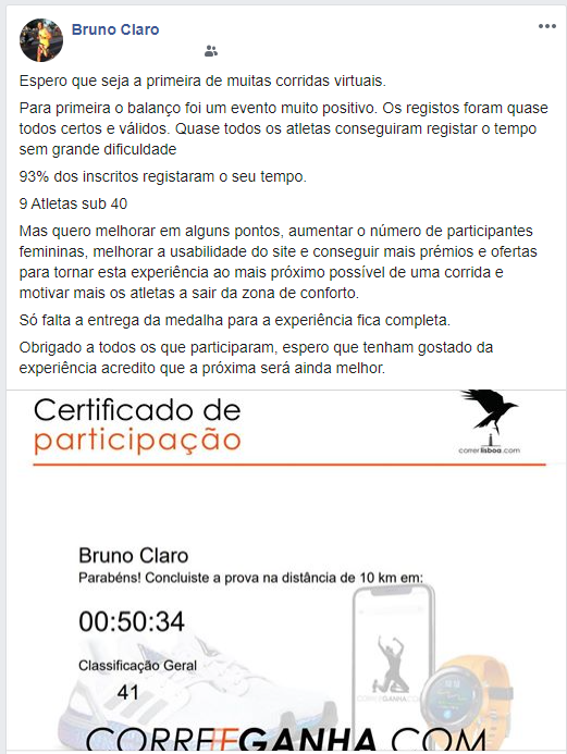 "Espero que seja a primeira de muitas corridas virtuais. Para primeira [prova - 10 km] o balanço foi um evento muito positivo. Os registos foram quase todos certos e válidos. Quase todos os atletas conseguiram registar o tempo sem grande dificuldade. 93% dos inscritos registaram o seu tempo."