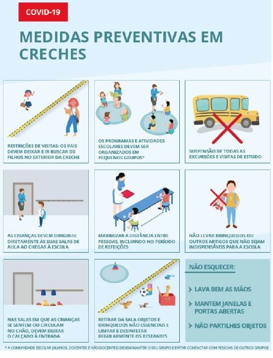 Antes da reabertura, a DGS quer que as creches façam uma atualização dos planos de contingência, que devem contemplar os procedimentos a adotar perante um caso suspeito de COVID-19 e a definição de uma área de isolamento, entre outras medidas.