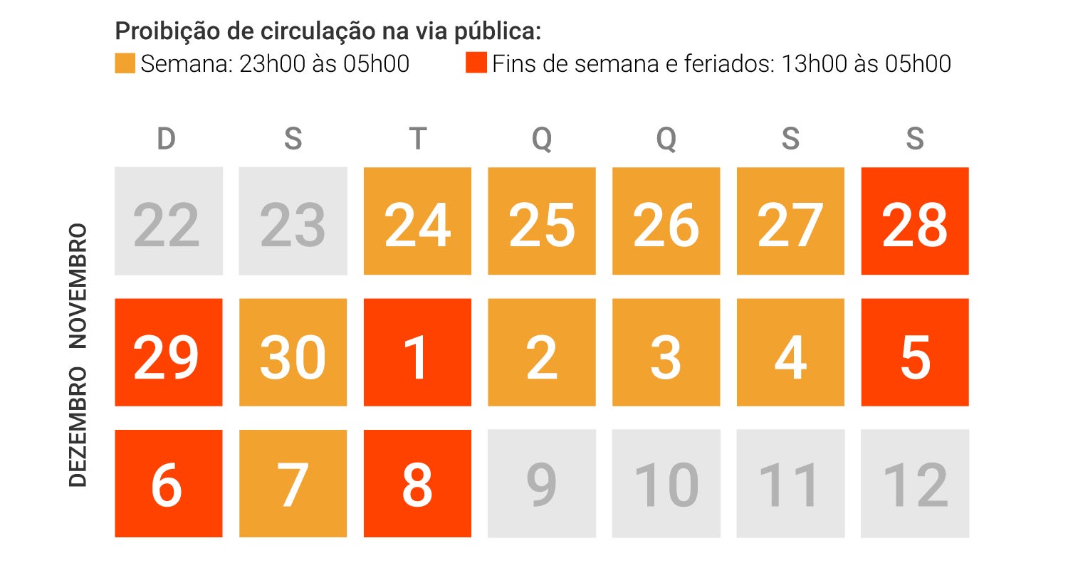 - Proibição de circulação na via pública entre as 23h00 e as 5h00;